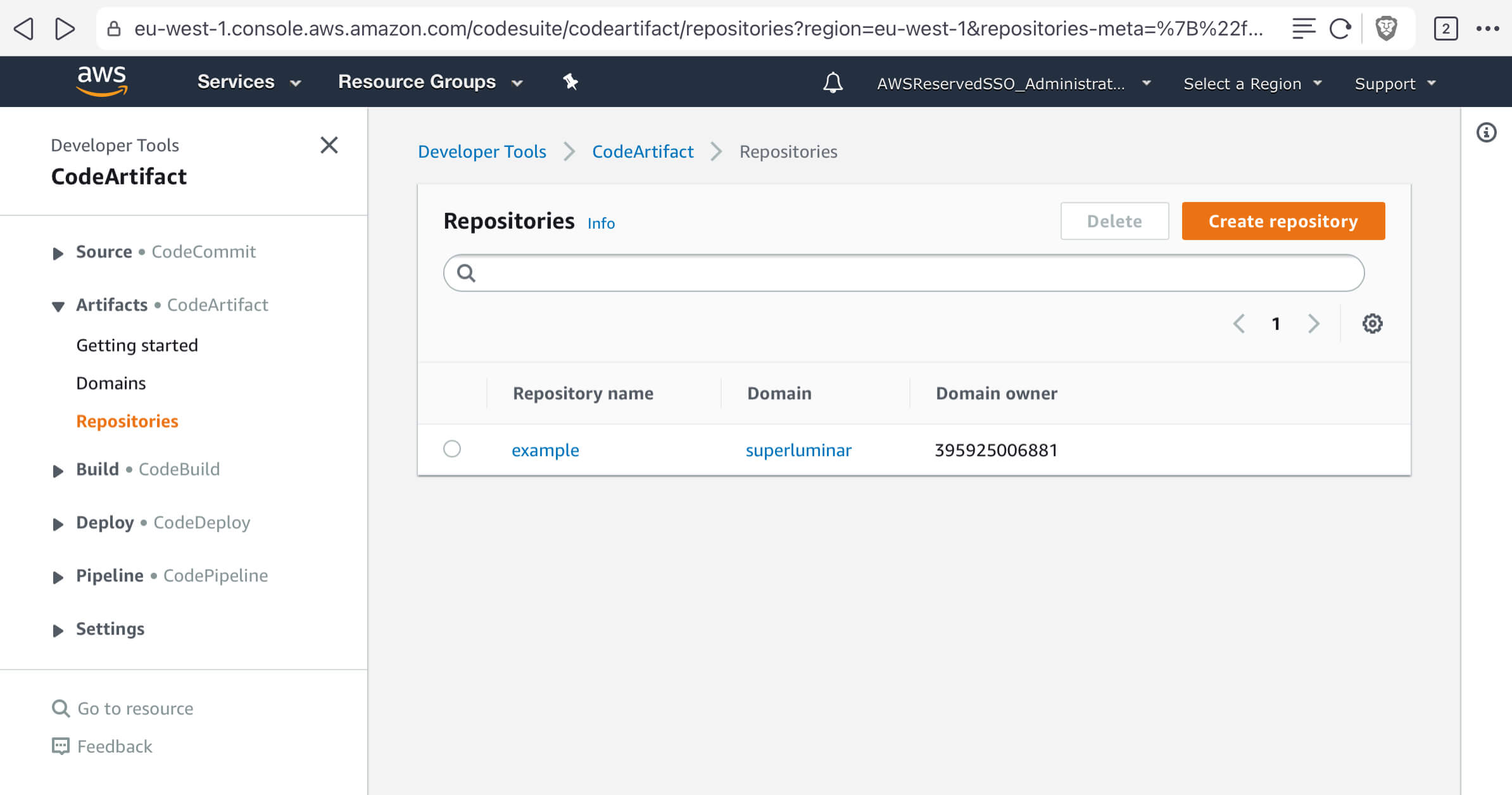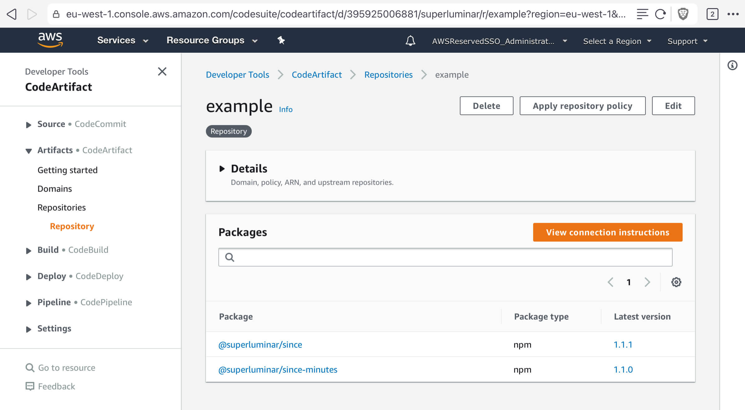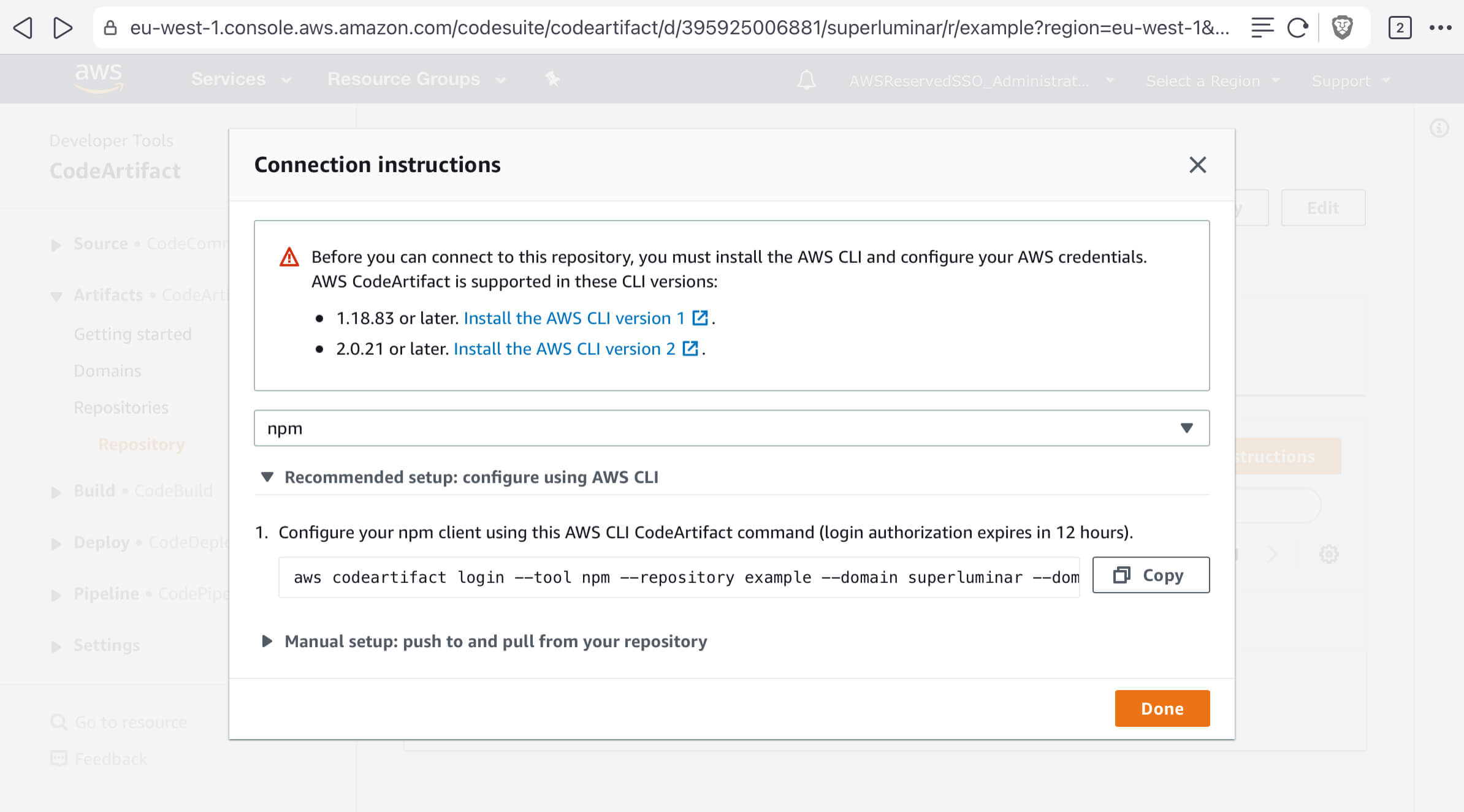Um bei dem Beispiel von oben zu bleiben: Das Paket aws-sdk soll natürlich aus der öffentlichen NPM Paketverwaltung installiert werden und das private Paket @superluminar/example aus der privaten Paketverwaltung die mit AWS CodeArtifact betrieben wird. Die Notwendigen Schritte zur Konfiguration von NPM finden sich direkt in der AWS Management Console von AWS CodeArtifact.